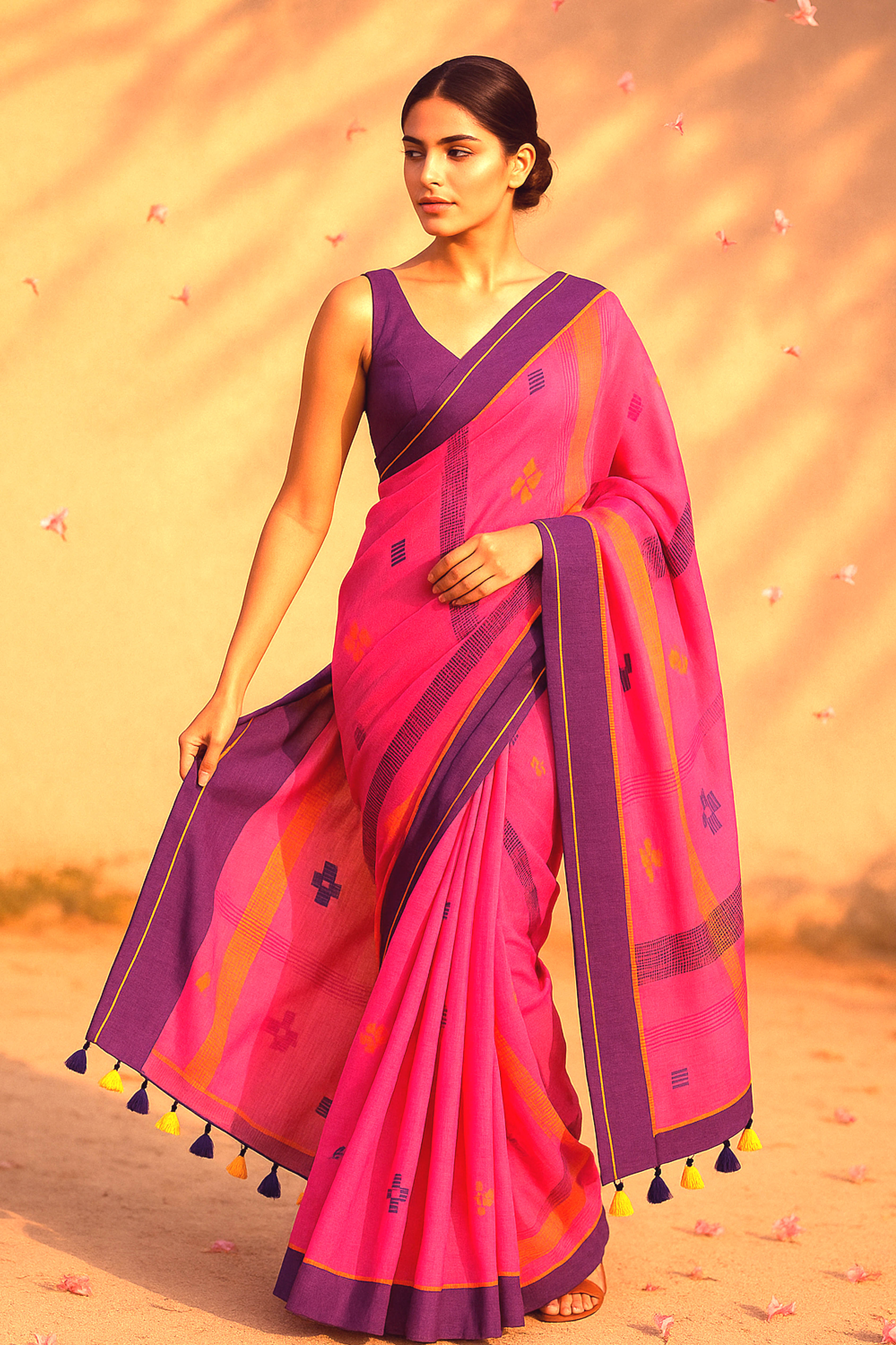 Kiran Cotton Silk Saree in Bold Fuchsia & Rich Tangerine Anchal