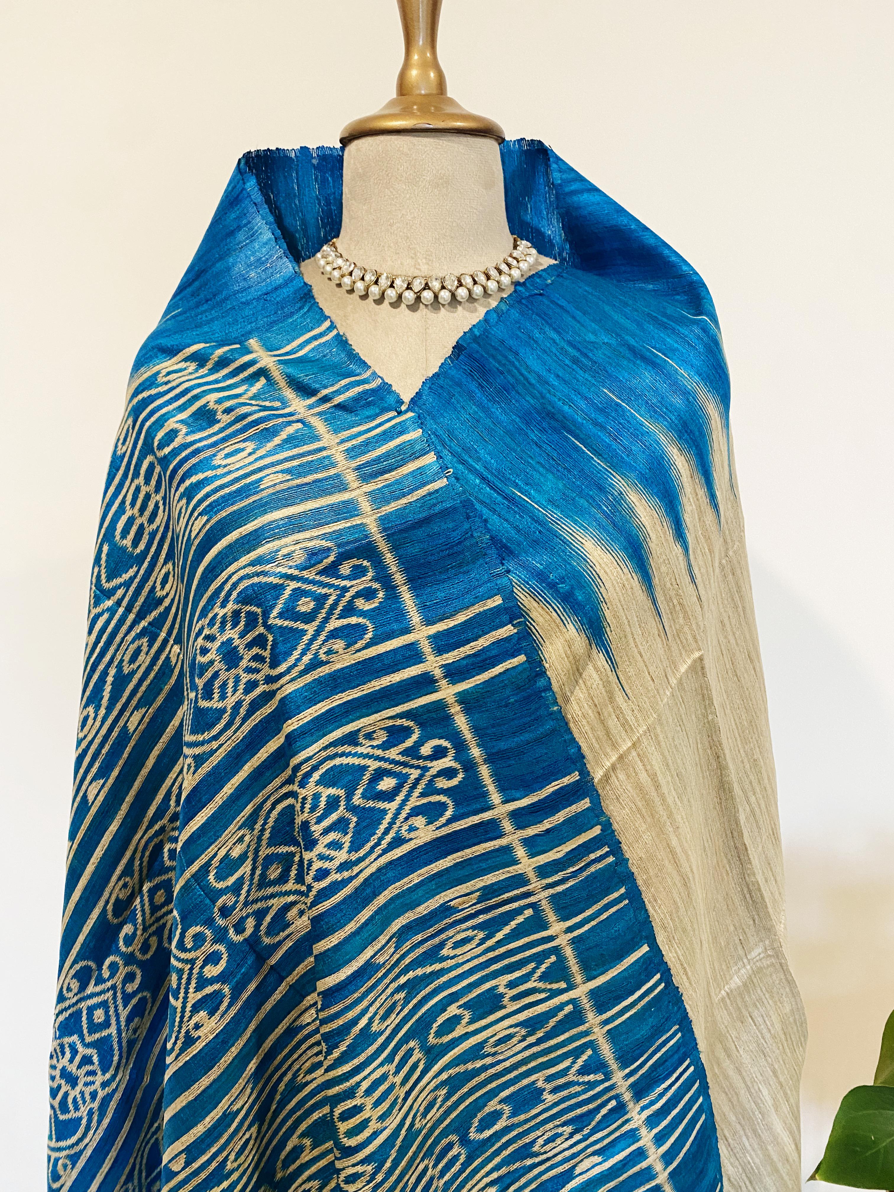 Aksara Pure Ghicha Tussar Silk Saree in Ikkat Design Beige & Peacock Blue