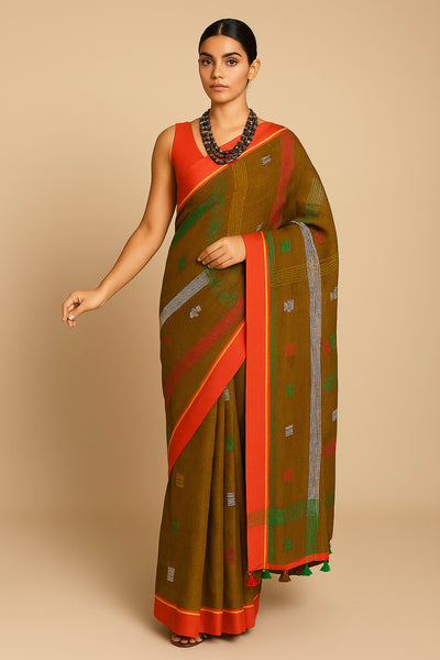Shop this elegant plain brown slub cotton hand painted saree with red border & pallu, and a matching running blouse. Ideal for office wear, casual outings, or minimal festive looks. Soft, breathable, and handloom-crafted.