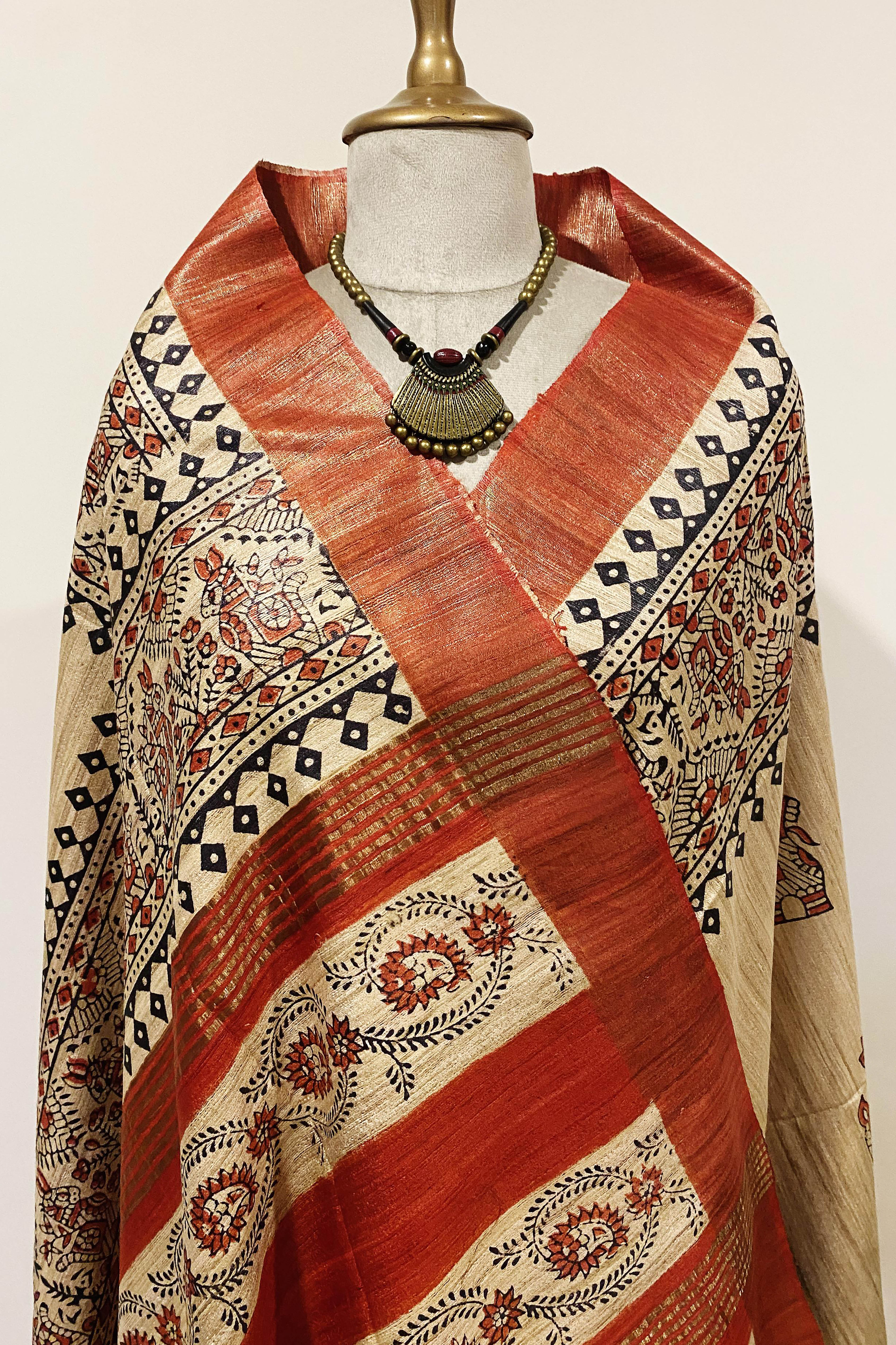 Gahana Pure Ghicha Tussar Silk Saree in Screen Printing Beige, Orange & Black