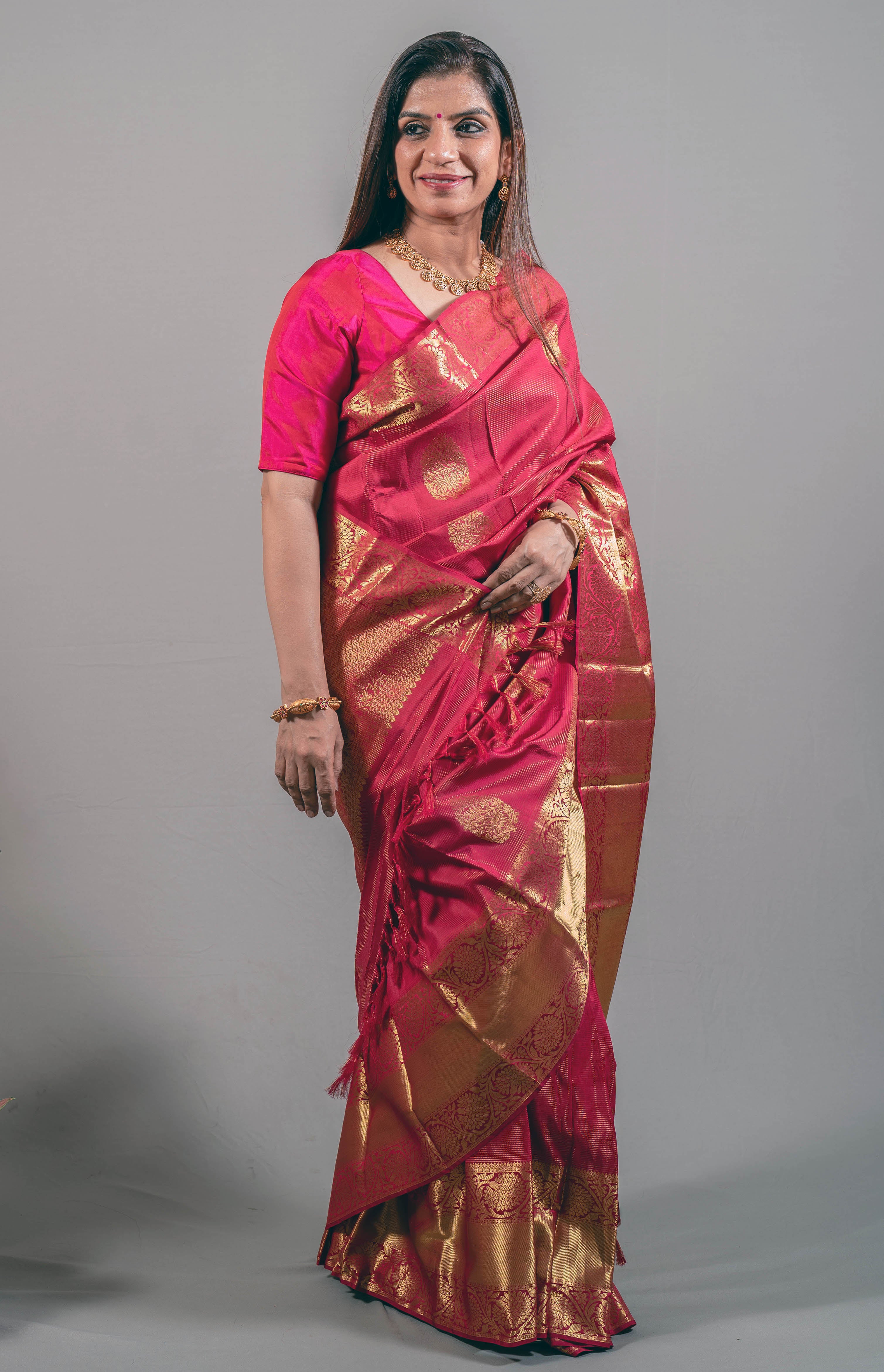Mahek Pure Silk Kanjivaram Saree in Bright Dark Pink with Golden Lotus Motifs