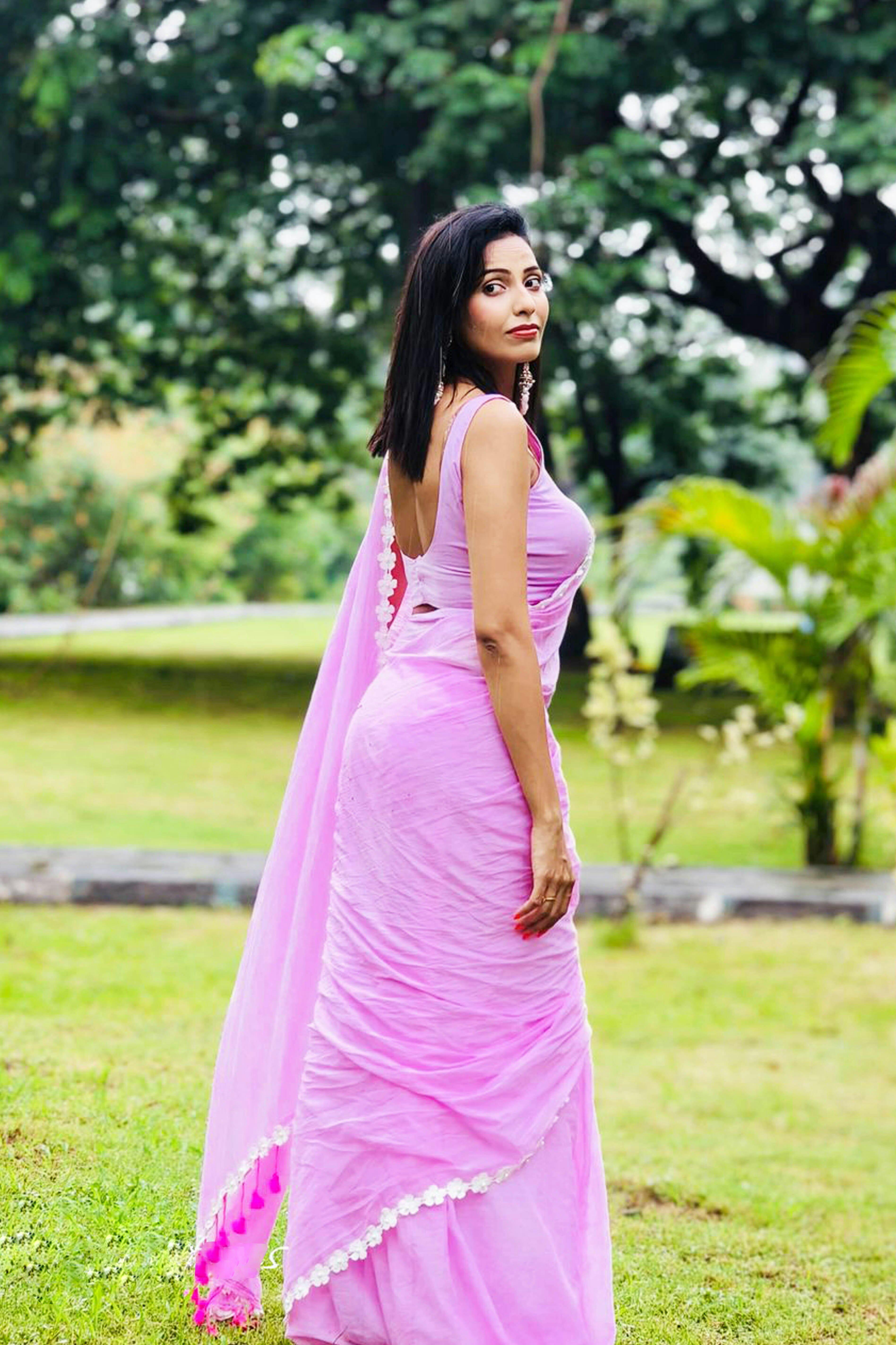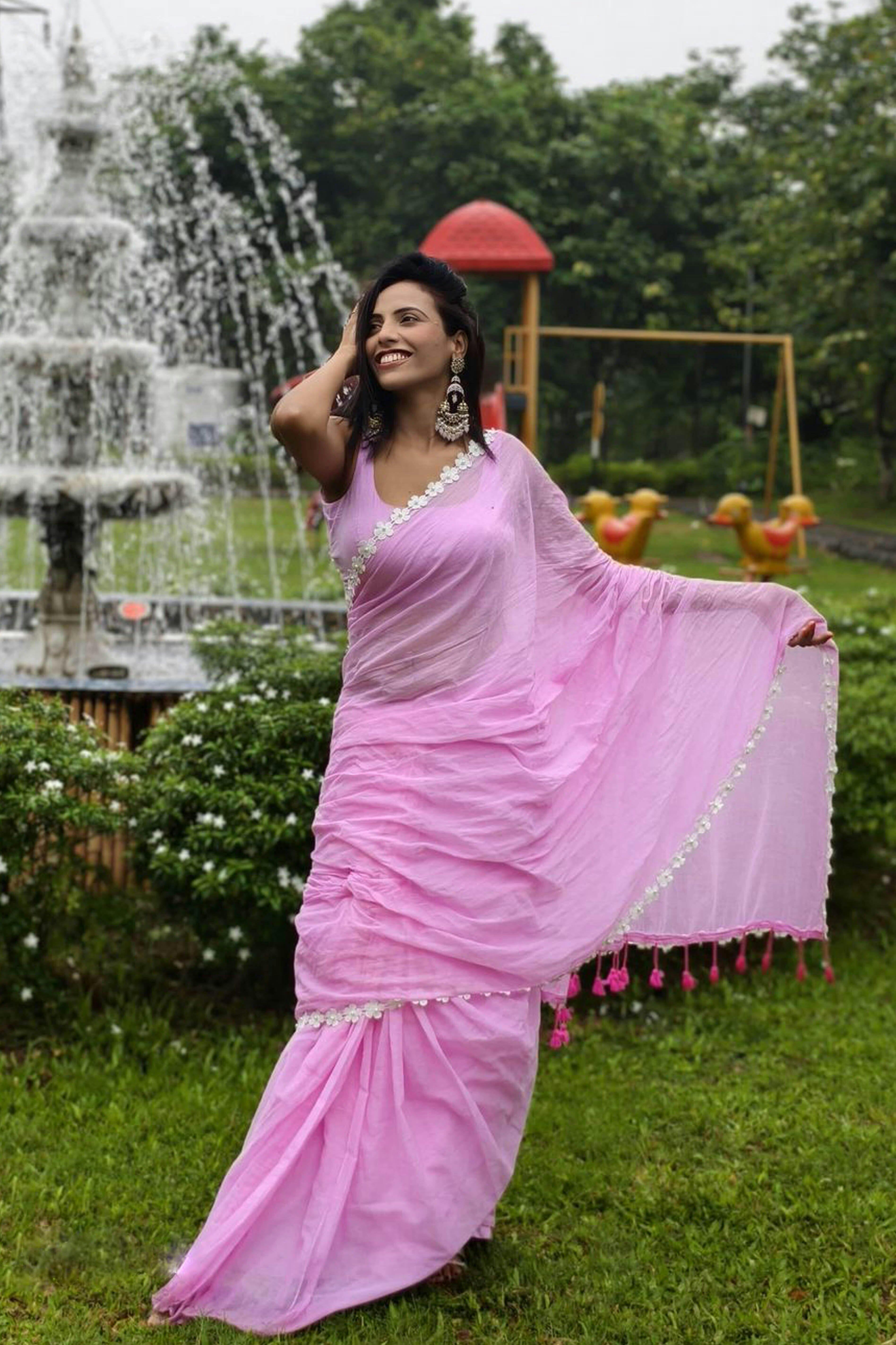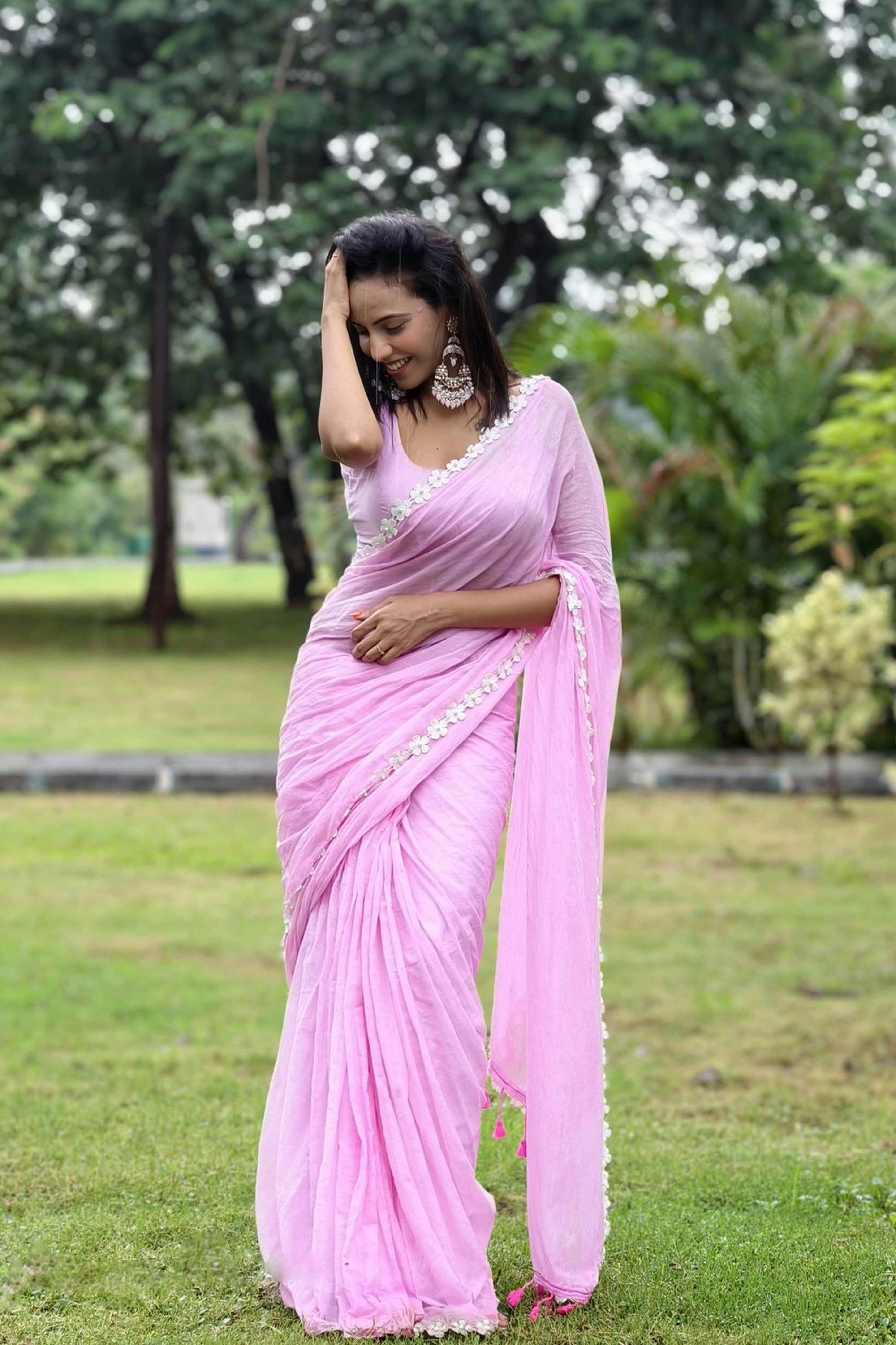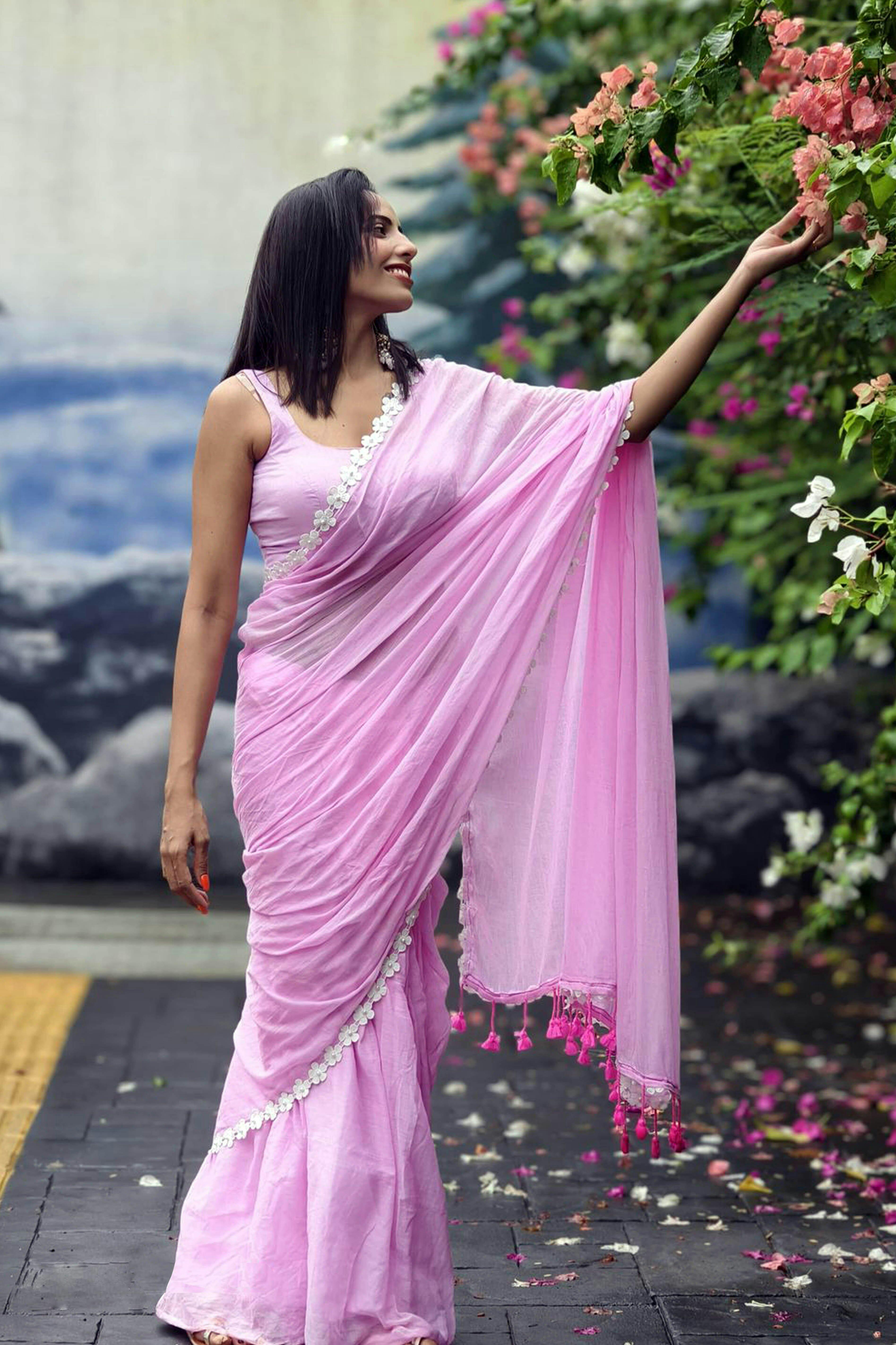 Pure Mul Cotton Saree in Pink with White Floral Lace
