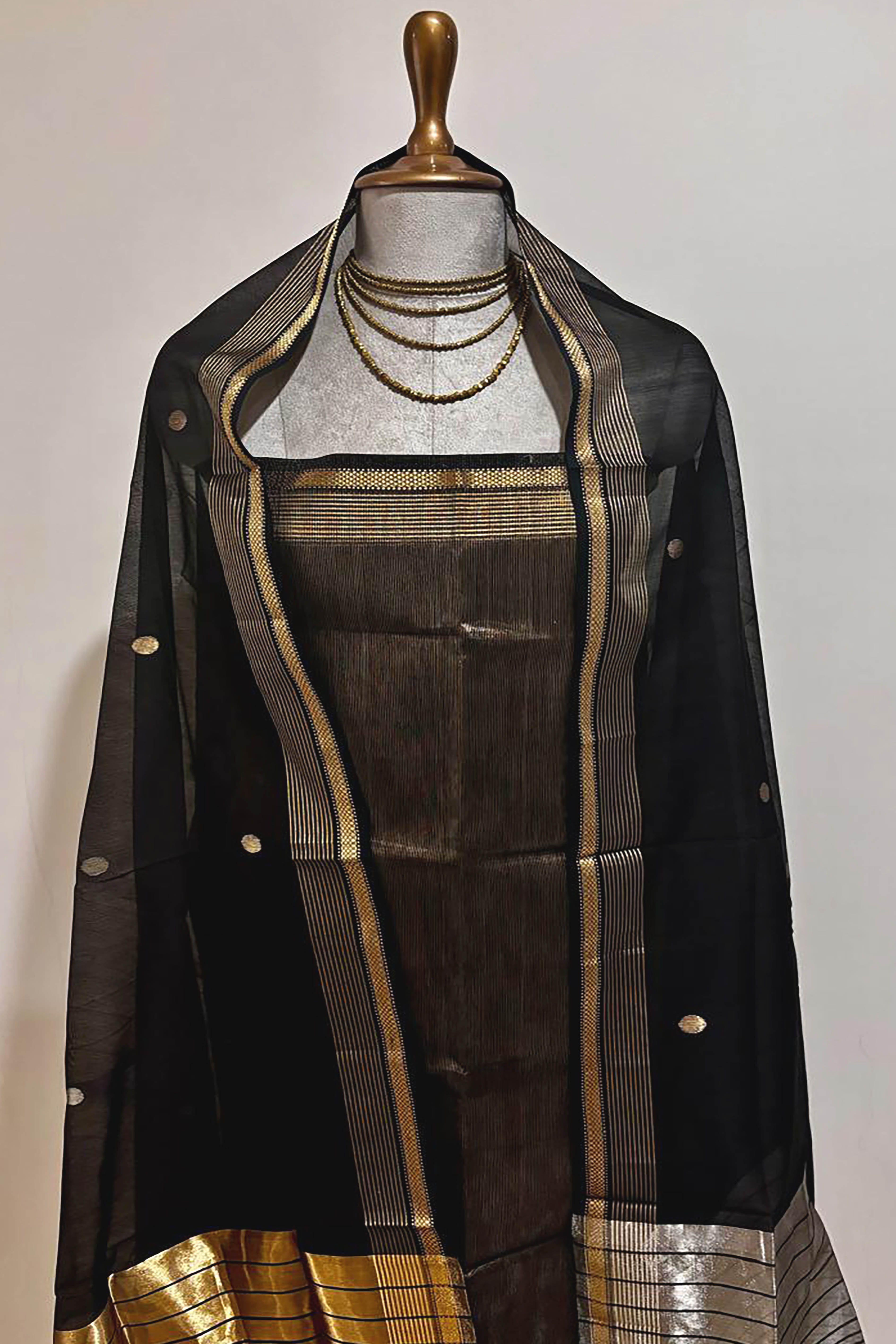 Immerse yourself in elegance with our Cotton Silk Tissue Maheshwari two-piece suit, presenting an unstitched kurta and dupatta ensemble. The kurta, in a delightful black tissue stripes, with small chatai border and stripes in golden. Lovely black cotton silk dupatta with golden & silver motifs and gold tissue pallu and similar border as that of kurta.
