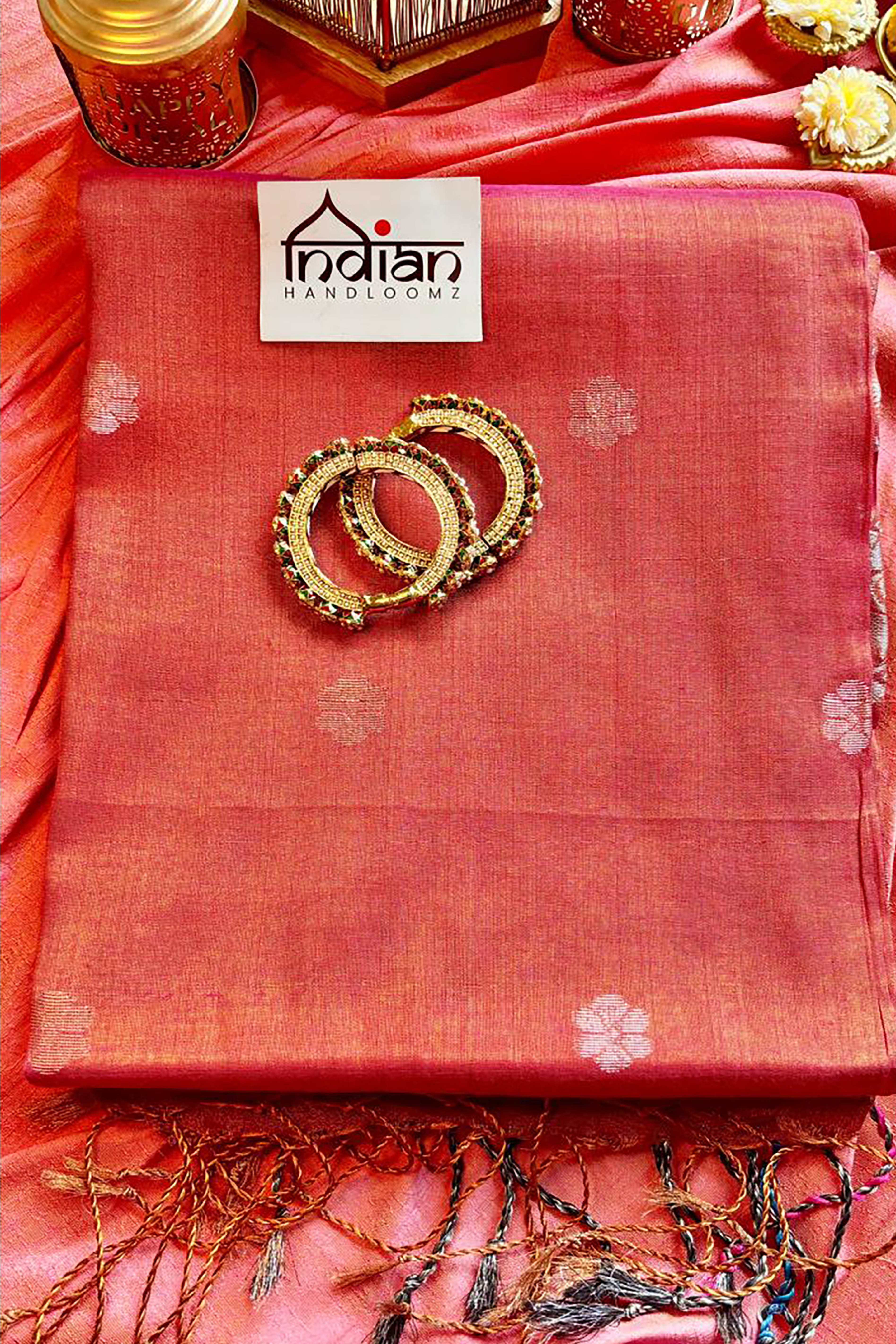 Exude earthy elegance with this reddish pink with golden raga tissue linen saree with banarasi weave. The deep, rich hue paired with the natural texture of linen creates a sophisticated and timeless look, making this saree ideal for festive occasions, evening events, or elegant daytime gatherings. Lightweight and comfortable, it blends traditional charm with modern grace, offering a versatile choice for the discerning saree lover.