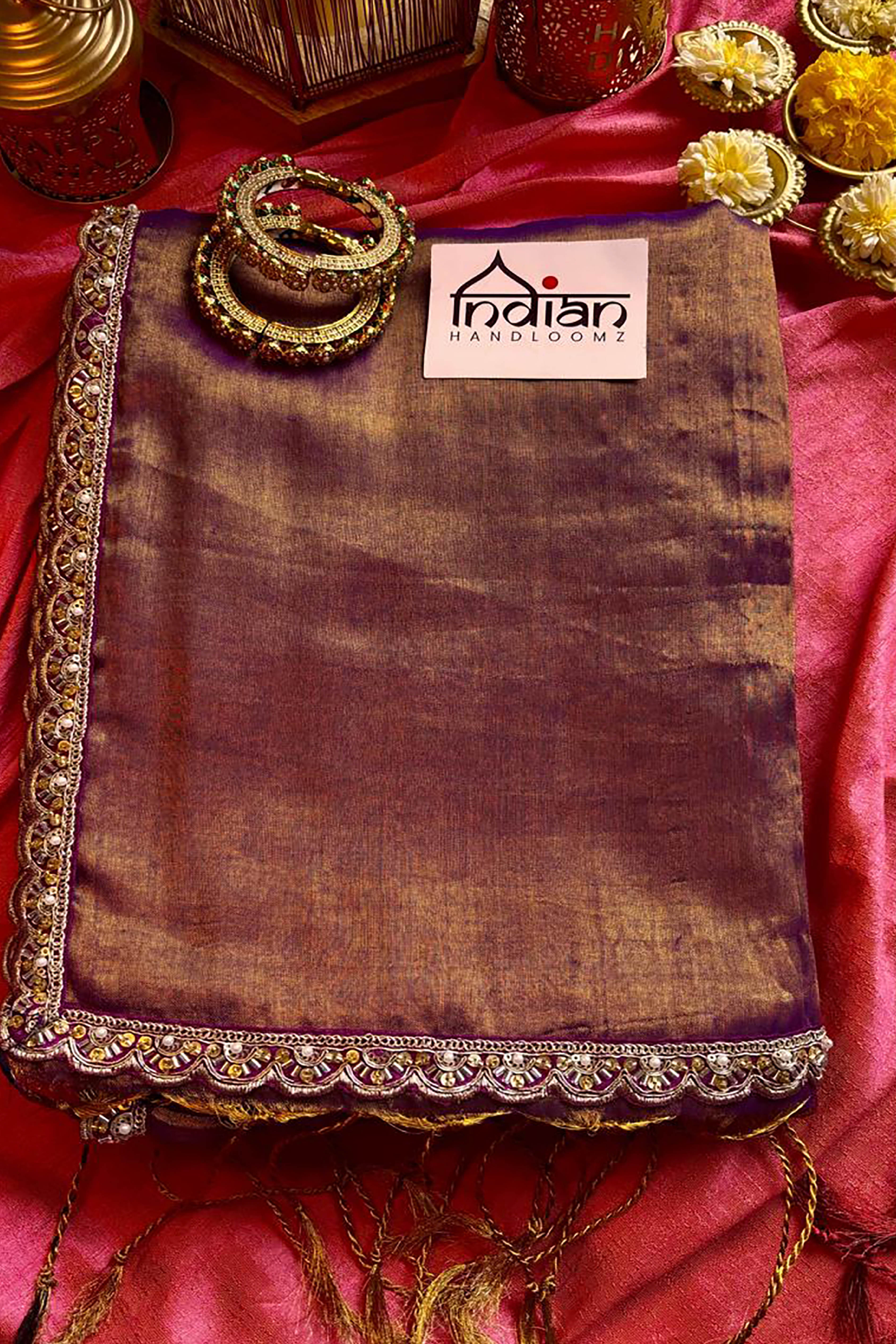Urja Pure Tissue Linen Saree in Purple & Gold Shades with Zardosi Border & Pearl Embedded