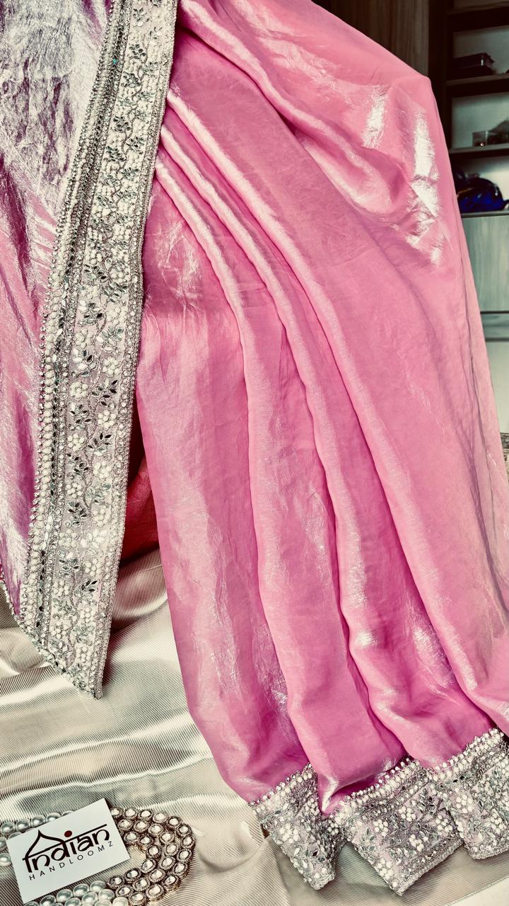 Venus Pure Satin Tissue Saree in Baby Pink Colour with Golden Sheen